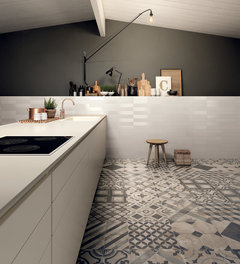 (20) commentiSono leita di averla aiutata. Se la cucina è chiara, può usare anche le mattanolle in tono piu scuro di quelle della foto, in modo da non staccare troppo con il pavimento esistente. Sempre ABK ha gres effetto marmo.. provi a recarsi in un negozio di ceramiche nella sua zona per vedere finuture di gress più affini con il suo pavimento. saluti Arch. Silvia Carrozzi di NICarch... mostra di piùTavolo, sedie e tende per cucina, di che colore e materiale comprarli?
