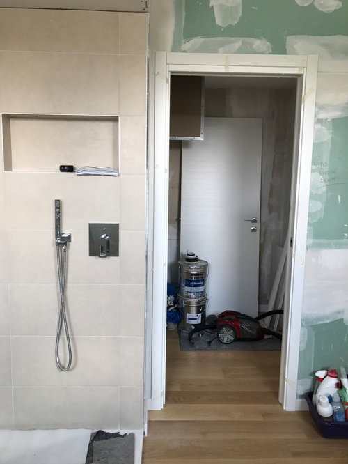 (3) commentiL'acciaio è un materiale riflettente quindi non rende poco luminoso e l'ingombro in questo caso è solo di 30cm sul totale della larghezza da chiuso che poi diventa tutta la larghezza quando si aprono le due porte a saloon. La dimensione degli elementi la fa la misura della larghezza dell'ambiente. Si tratta di una realizzazione su misura, quindi in base alle misure del suo ambiente va fatto un progetto apposito.... mostra di piùdimensione piastrelle (120x120 vs 80x80) e piastrelle parete doccia