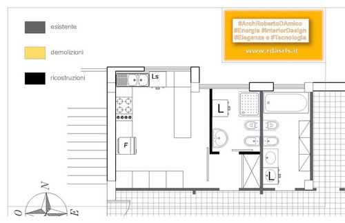 Ottima idea invertire la posizione di bagno e cucina. Non mi sembra invece ideale dividere la finestra tra cucina e bagno così come accedere alla cucina da un disimpegno comune a quello del bagno. Preferirei avere piuttosto una cucina con accesso diretto al living, ampliare il bagno nuovo inglobandolo al nuovo disimpegno e magari dedicare il secondo bagno esclusivamente alla camera da letto padronale. Avere due lavatrici in due bagni diversi lo trovo strano ma evidentemente è una necessità della committenza.