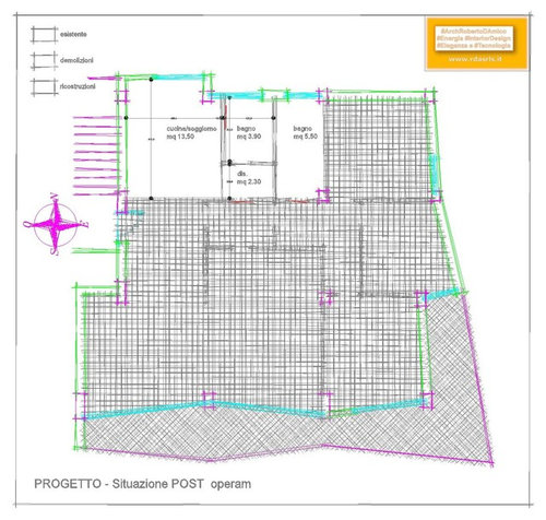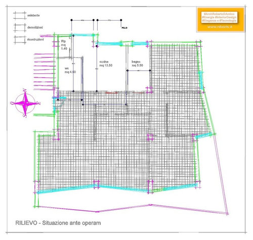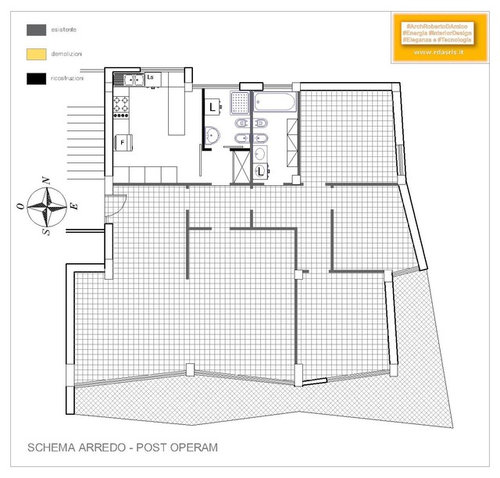 nell'ante operam ci sono due bagni distanti ed uno stanzino pieno di..ricordi...con la proposta si affiancano i bagni vicino allo scarico principale e si ottiene ..un gran bel spazio per la cucina...tutto da arredare...