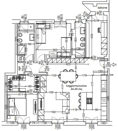 (56) commentiANCORA IN ALTO MARE PER LA POSIZIONE DEL BAGNO. Ho avuto i seguenti commenti al mio disegno di bagno (piccolo ma funzionale) in uno spazio di mt. 2,62 x 1,40, sacrificando eventualmente il bidet. Ho previsto anche una finestra o sopraluce per dare luce allo svincolo cucina/ingresso tinello. Ma il tecnico incaricato mi dice “impostando la pratica come risanamento conservativo, ma viene un bagnetto molto sacrificato "stretto", nello stanzino non può esserci un WC, si può insere in un antibagno " cioè con accesso diretto al bagno " un lavabo, ma il bagno deve essere completo di Doccia/vasca, Bidet, WC e lavabo, tra cui il lavabo ed il WC sulla stessa parete. Per quello che riguarda la finestra l'unica è aprire un piccolo sopraluce. In conclusione l'unica possibilità è fare un bagnetto con tutti gli accessori cosi come l'hai disegnato (ma molto piccolo) oppure si ritorna alla prima ipotesi, con l'accesso al bagno dal corridoio che funge da disimpegno e alla camera con l'apertura di una porta.” Questa sopra è la mia ipotesi ma sembra che un bagno per essere a norma deve avere tutti i sanitari !!!!???? Il disegno qui sotto è quello proposto dal tecnico: Questo è quello che mi piacerebbe, mettendo al posto del wc un piatto doccia. Da considerare che si tratta di un edificio del 1930/40...... Qualsiasi commento è ben accettato e se l'idea di soluzione definitiva sarà ben accettata ed, se necessario retribuita...... Grazie George... mostra di piùristrutturare completamente un appartamento di circa 100 mq