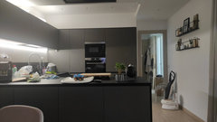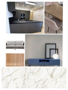 (2) commentiCiao, anche per me con il grigio non otterrete l'effetto di svecchiamento che desiderate. Una soluzione potrebbe essere questa come da figura. Trovo che l'ambiente si avvicini molto al vostro e manterrei questo stile, fossi in voi. Nessun colore per le pareti o paraschizzo. Lascerei tutto bianco e punterei su un pavimento bello importante, limitandomi alla zona cucina.... mostra di piùcolori/abbinamenti cucina grigia