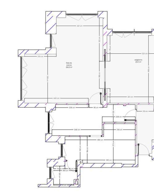 Ciao a tutti, devo organizzare gli spazi della zona giorno che attualmente sono divisi in cucina ad L, tinello, sala da pranzo e salotto. Foto 1; premesso che ho bisogno di uno studio/camera ospiti sono molto indecisa se trasformare l'attuale cucina in studio/ospiti (ci sarebbe anche bagnetto) l'attuale tinello in una cucina piccola e lasciare la sala da pranzo così com'è oppure realizzare una grande cucina molto grande unendo cucina e tinello e ricavare nella sala da pranzo una zona studio e all'occorrenza trasformarla in stanza ospiti, scegliendo magari al posto di un tavolo allungabile una consolle, le finestre della cucina e del tinello sono porte finestre.