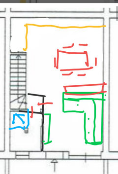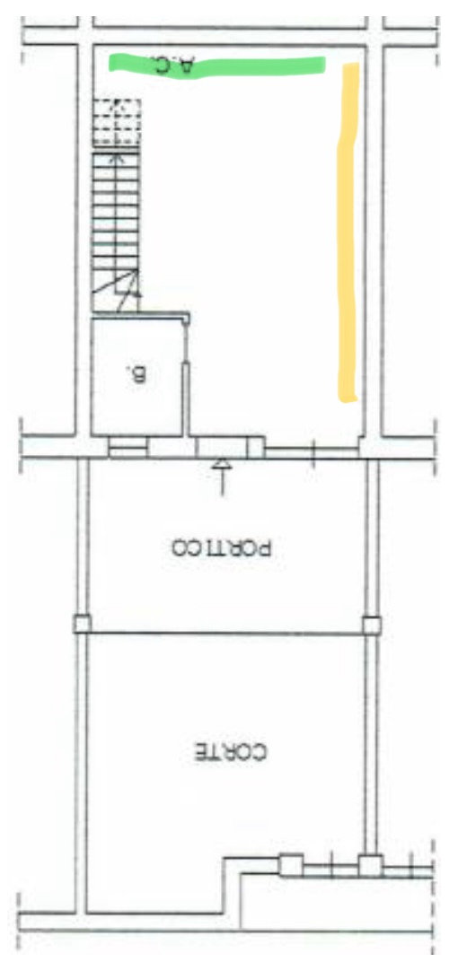 La parete di fondo dove realizzeremo una cucina lineare misura 4,80mt (in verde) e la parete lunga fino all'ingresso sono circa 7mt (in giallo). Accanto alla porta di ingresso c’è il bagno con la sua porta e subito una scala.