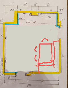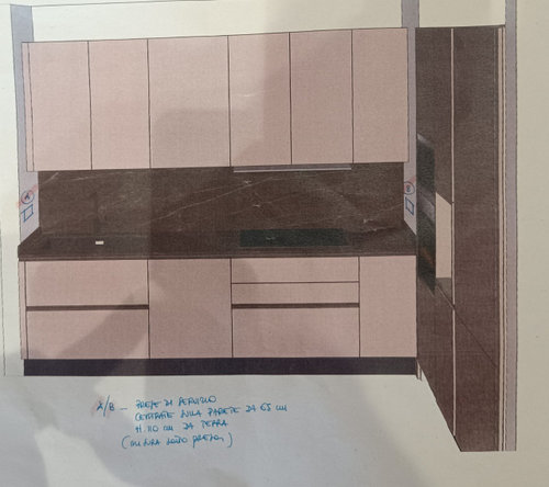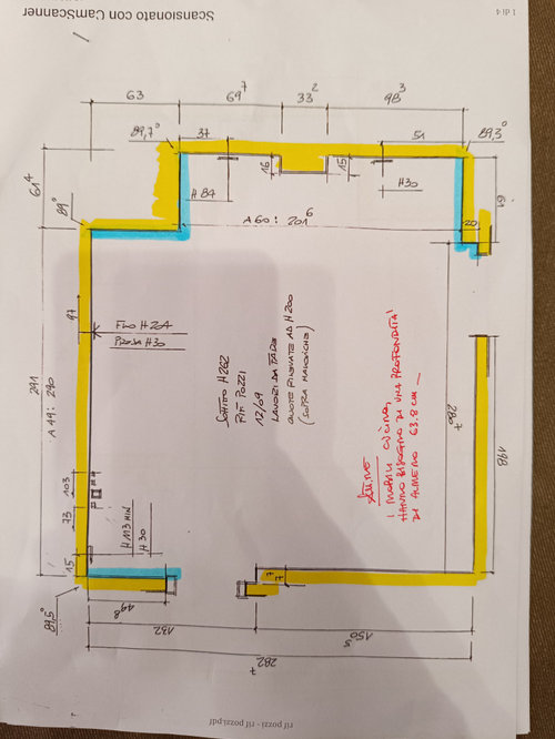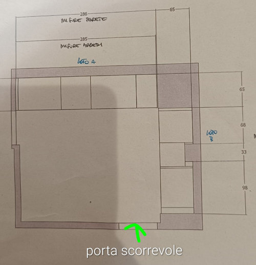 Il totale dello spazio "libero" (già tolti ingombri di pensili ed elettrodomestici è di 217cm x 270cm. (Il lato più lungo è quello parallelo alla parete di ingresso).