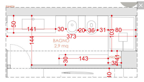 Faccio altra discusione su altro bagno...sempre box doccia. Allego progetto bagno... anche se in realtà poco fa è passato il mio rivenditore e mi ha detto che questo anta battente non aprirebbe bene...