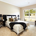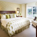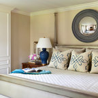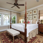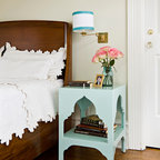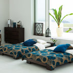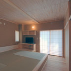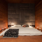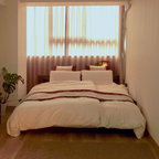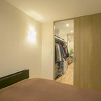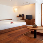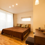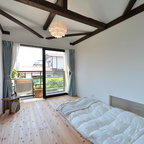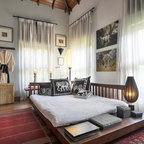 Ispirazione per una camera matrimoniale etnica con nessun camino, parquet chiaro e pareti bianche — Houzz