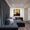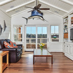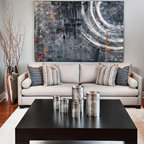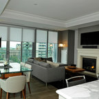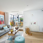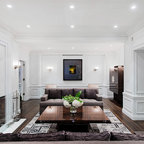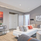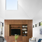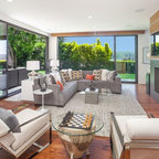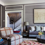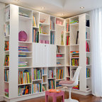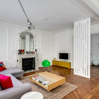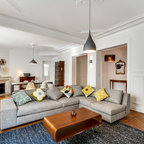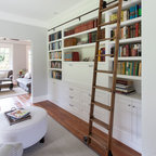 Foto di un soggiorno design con libreria, pareti grigie e parquet scuro — Houzz