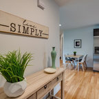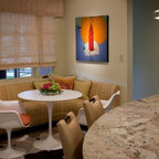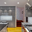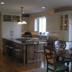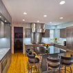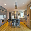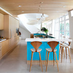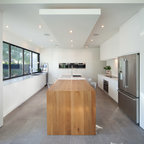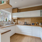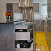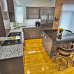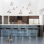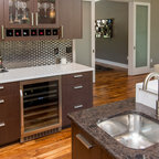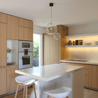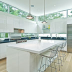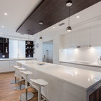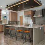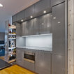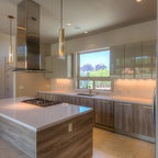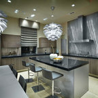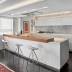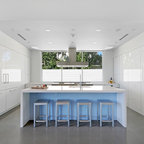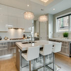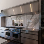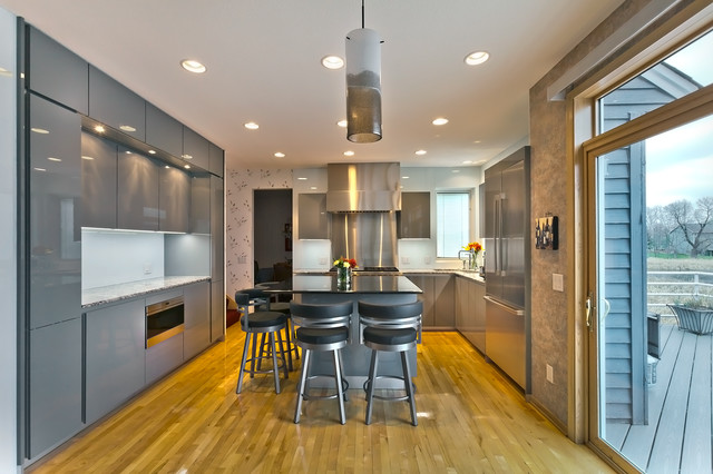 Ispirazione per una cucina design di medie dimensioni con lavello sottopiano, ante lisce, ante grigie, top in granito, paraspruzzi bianco, paraspruzzi con lastra di vetro, elettrodomestici in acciaio inossidabile, parquet chiaro e isola — Houzz