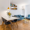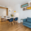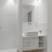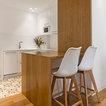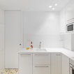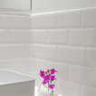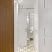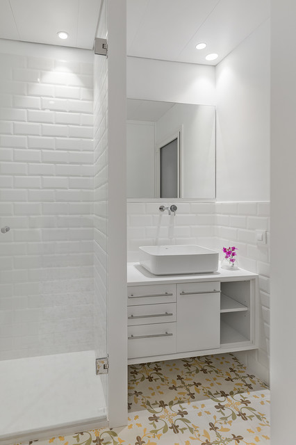 Revestimiento azulejo tipo metro blanco muy chulo y dando mucha luz combinado con pavimento hidráulico colores pastel muy alegres pero a su vez que no cansan.