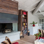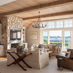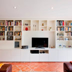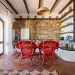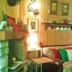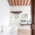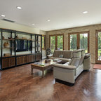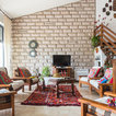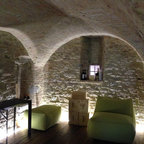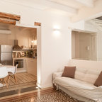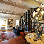 Foto di un soggiorno mediterraneo con pareti marroni, pavimento in terracotta e pavimento rosso — Houzz