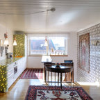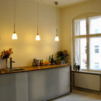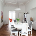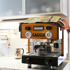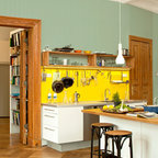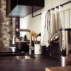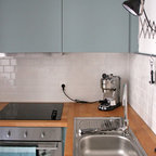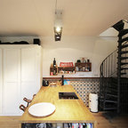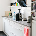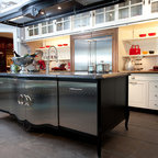Idee per una grande cucina ad ambiente unico eclettica con elettrodomestici in acciaio inossidabile, pavimento in legno massello medio, ante lisce, ante grigie, paraspruzzi grigio e lavello a vasca singola — Houzz