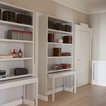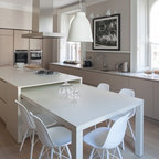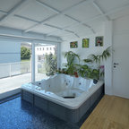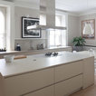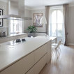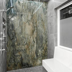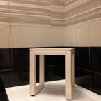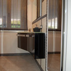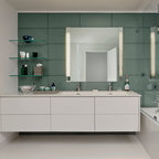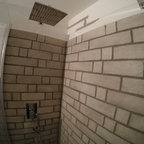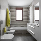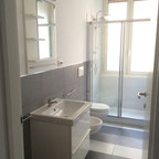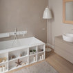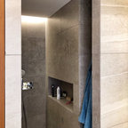 Immagine di una grande stanza da bagno minimalista con ante lisce, ante beige, doccia a filo pavimento, WC sospeso, piastrelle beige, piastrelle di cemento, pareti beige, parquet chiaro, lavabo a bacinella, top in superficie solida, pavimento beige e porta doccia a battente — Houzz