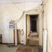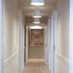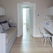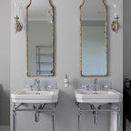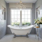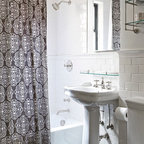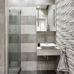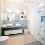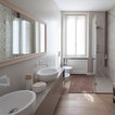 Nello specchio del bagno si riflettono le cementine decorate sulla parete di fondo della doccia