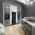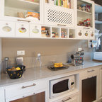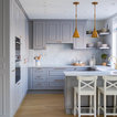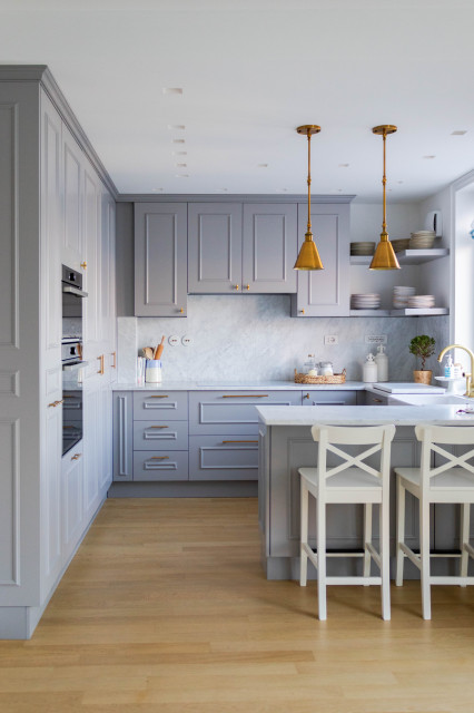 Ispirazione per una cucina ad U chic con lavello stile country, ante con riquadro incassato, ante grigie, paraspruzzi grigio, paraspruzzi in lastra di pietra, elettrodomestici in acciaio inossidabile, parquet chiaro, penisola, pavimento beige e top bianco — Houzz