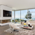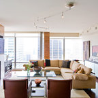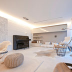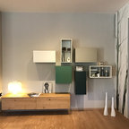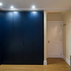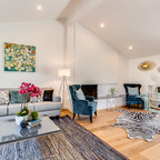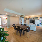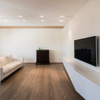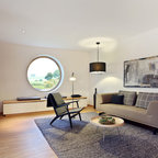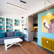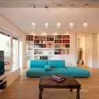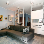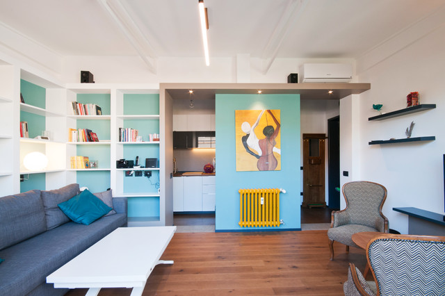 Foto di un piccolo soggiorno design con pareti blu, pavimento in legno massello medio e pavimento marrone — Houzz