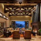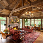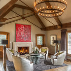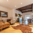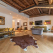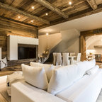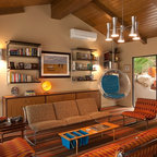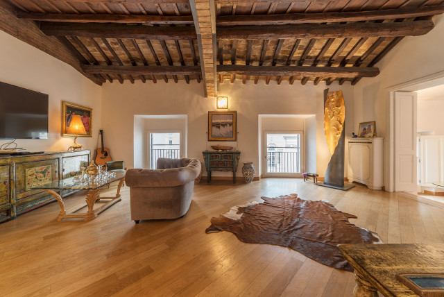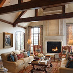 Immagine di un soggiorno mediterraneo con pareti beige, pavimento in legno massello medio, TV a parete e pavimento marrone — Houzz