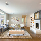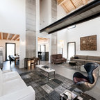 Ispirazione per un piccolo soggiorno industriale aperto con libreria, pareti bianche, pavimento in legno massello medio e pavimento marrone — Houzz