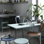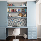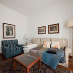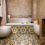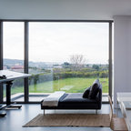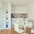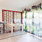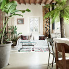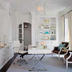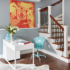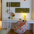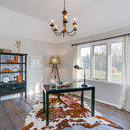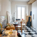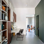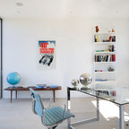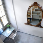 Foto di un ufficio eclettico con pareti bianche, pavimento in cemento, scrivania autoportante e pavimento marrone — Houzz