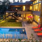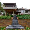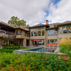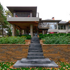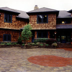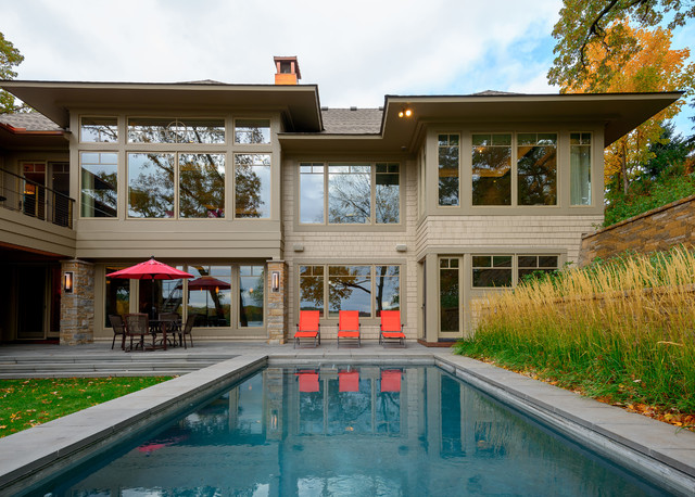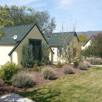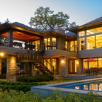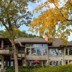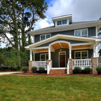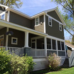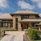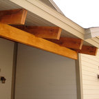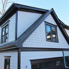 Immagine della facciata di una casa american style a un piano con rivestimento in legno — Houzz