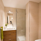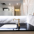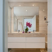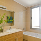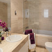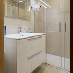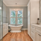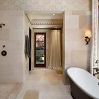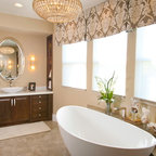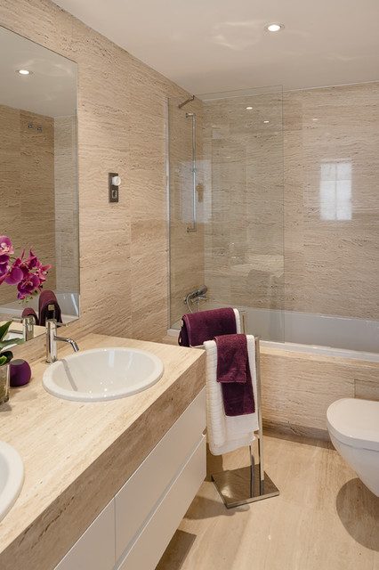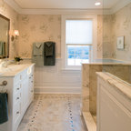 Ispirazione per una stanza da bagno padronale classica di medie dimensioni con ante lisce, ante bianche, vasca ad alcova, vasca/doccia, pareti beige e lavabo da incasso — Houzz