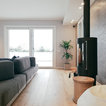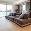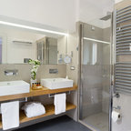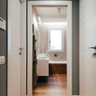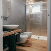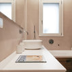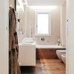 Bagno padronale con parquet e vasca. Pareti in resina