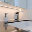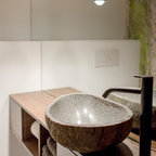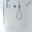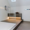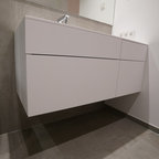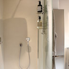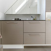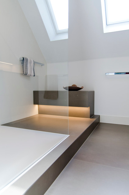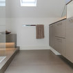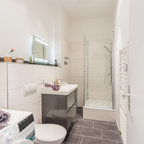 Das nur 7qm große Bad der Maisonettewohnung wurde komplett umgestaltet, die Badewanne entfiel. Dafür wurde eine großzügige , flächenbündige Dusche eingebaut. Ebneso wurde vei Stauraum - durch optimale Ausnutzung der Gegebenheiten geschaffen. Die Großzügigkeit wird unterstrichen durch die großformnatigenFleisen der Serie Size by Neolith.