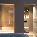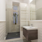 Immagine di una piccola stanza da bagno con doccia minimalista con ante lisce, ante grigie, doccia a filo pavimento, WC a due pezzi, piastrelle multicolore, piastrelle in ceramica, pareti grigie, pavimento con piastrelle in ceramica, lavabo integrato e top in acciaio inossidabile — Houzz