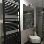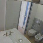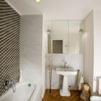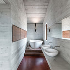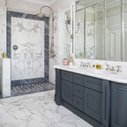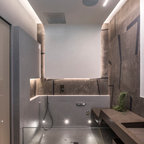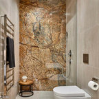 Ispirazione per una stanza da bagno padronale moderna con lastra di pietra, pavimento in marmo, doccia alcova, piastrelle grigie e porta doccia a battente — Houzz