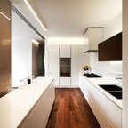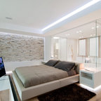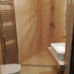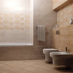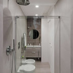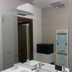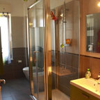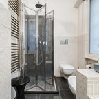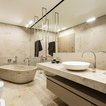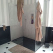 Idee per una stanza da bagno padronale minimalista con pareti beige, lavabo a colonna, top in marmo, top nero, doccia a filo pavimento, piastrelle marroni, pavimento beige e doccia aperta — Houzz