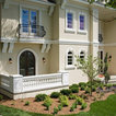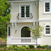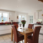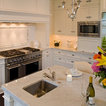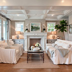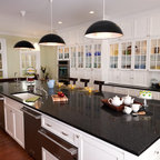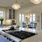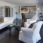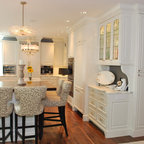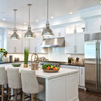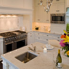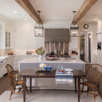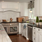 Ispirazione per una grande cucina chic con lavello stile country, top in marmo, ante a filo, ante bianche, paraspruzzi bianco, paraspruzzi con piastrelle diamantate, elettrodomestici in acciaio inossidabile, parquet scuro, isola, pavimento marrone e top bianco — Houzz