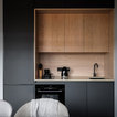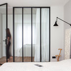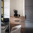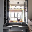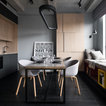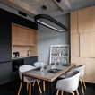 В качестве основного стиля был выбран минимализм с элементами лофта. Само пространство с высокими потолками, балками на потолке и панорамным окном уже задавало особое настроение. При перепланировке решено было использовать минимум перегородок. На стене между кухней-гостиной и гардеробом прорезано большое лофтовое окно, которое пропускает свет и визуально связывает два пространства.