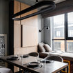 В помещении предусмотрено несколько сценариев освещения. Для равномерного освещения всего пространства используются поворотные трековые и точечные светильники. Зона кухни и спальни украшены минималистичными металлическими люстрами. В зоне отдыха на подоконнике - бра для чтения.