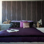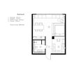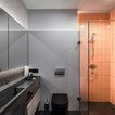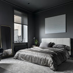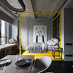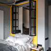 Основная цветовая гамма — монохром. Светло-серые стены, потолок и текстиль, темный пол, черные металлические элементы, и немного светлого дерева на фасадах корпусной мебели. Сдержанную и строгую цветовую гамму разбавляют яркие акцентные детали: желтая конструкция кровати, красная рама зеркала в прихожей и разноцветные детали стеллажа под окном.
