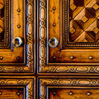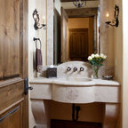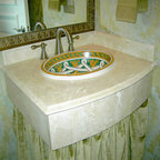Ispirazione per una piccola stanza da bagno mediterranea con WC sospeso, piastrelle blu, piastrelle a mosaico, ante lisce, ante in legno bruno, pavimento con piastrelle a mosaico e lavabo sottopiano — Houzz