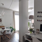 Idee per un soggiorno scandinavo di medie dimensioni e aperto con pareti blu, pavimento con piastrelle in ceramica e TV autoportante — Houzz