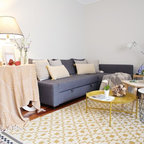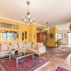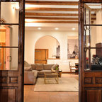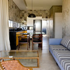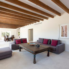 Questo ambiente è stato ricavato chiudendo il cortile della casa principale e pavimentando tutto il piano terra con cemento pulito. In questo caso è stato sacrificato il pavimento originale, ma le pareti in pietra hanno il compito di conservare l’atmosfera tradizionale, proprio come gli stipiti e le cornici delle porte.Il divano, disegnato da Isabel García Tapia, è il grande protagonista dell’ambiente, col suo color verde menta e con la tappezzeria floreale. Sul pavimento è presente un tappeto di sparto di Antonia Molina, un’azienda di Murcia specializzata in arazzi artigianali. Il tavolino al centro è stato progettato da Oito Interiores e realizzato con una lastra di acciaio.«L’illuminazione naturale in questa zona proviene dalle finestre originarie, alle quali sono state aggiunte nuove aperture, come un lucernario posizionato sul tetto del salone. L’illuminazione notturna è tenue ed è stata realizzata con elementi decorativi, come ad esempio alcune applique di rame realizzate da un artigiano portoghese», precisa Javier.