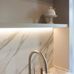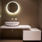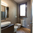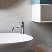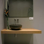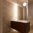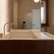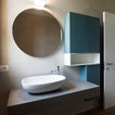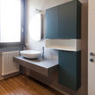 Mobile lavandino su disegno, vasca in corian sempre a disegno. Rubinetteria inox CEA - GESSI