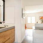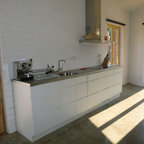Idee per una grande cucina parallela industriale chiusa con paraspruzzi bianco, nessun'anta, ante bianche, top in superficie solida, paraspruzzi con piastrelle diamantate, elettrodomestici in acciaio inossidabile e pavimento in legno massello medio — Houzz