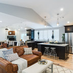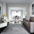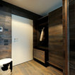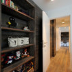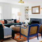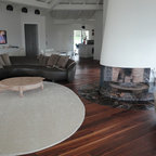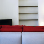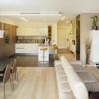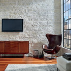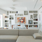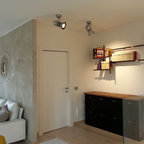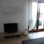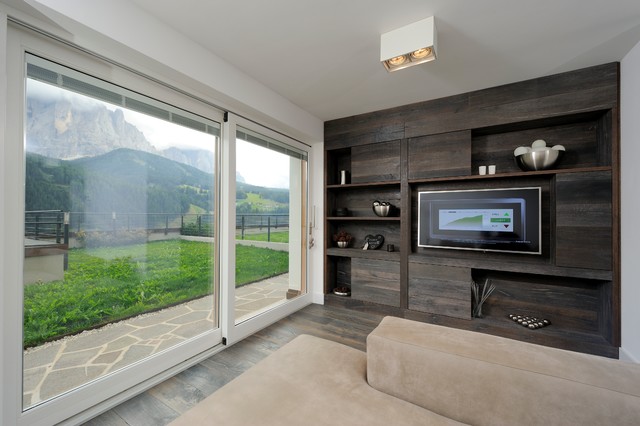 Immagine di un piccolo soggiorno minimal aperto con libreria, pareti multicolore, pavimento in legno massello medio, TV a parete e pavimento marrone — Houzz