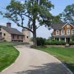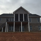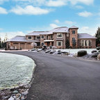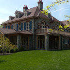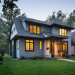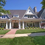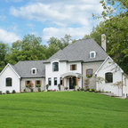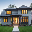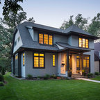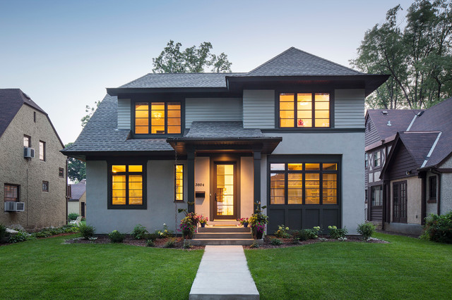Esempio della facciata di una casa grigia classica a due piani di medie dimensioni con rivestimento in stucco e tetto a padiglione — Houzz