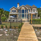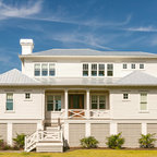 Classic Island beach cottage exterior of an elevated historic home by Sea Island Builders. Light colored white wood contract wood shake roof. Juila Lynn