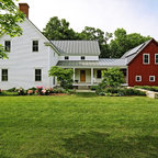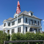 Idee per la facciata di una casa unifamiliare bianca stile marinaro a tre o più piani con rivestimento in legno, tetto a padiglione e copertura a scandole — Houzz