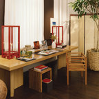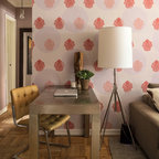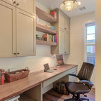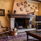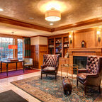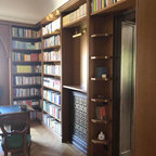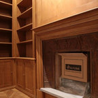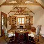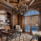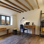 Ispirazione per uno studio classico con camino classico, pareti bianche, pavimento in legno massello medio e pavimento marrone — Houzz