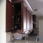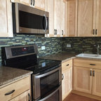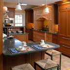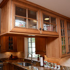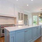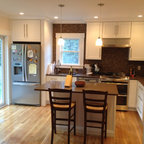 Esempio di una cucina a L classica con lavello stile country, ante con riquadro incassato, ante bianche, paraspruzzi bianco, paraspruzzi con piastrelle diamantate, elettrodomestici in acciaio inossidabile e parquet scuro — Houzz