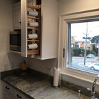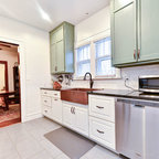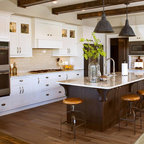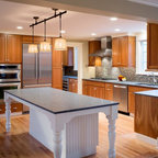 Esempio di una cucina country di medie dimensioni con lavello sottopiano, ante con bugna sagomata, ante in legno scuro, top in granito, paraspruzzi grigio, paraspruzzi con piastrelle in ceramica, elettrodomestici in acciaio inossidabile e parquet chiaro — Houzz