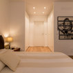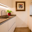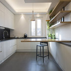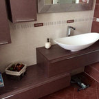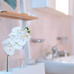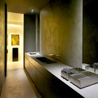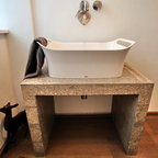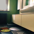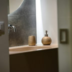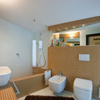 Foto di un bagno di servizio moderno con ante lisce, ante bianche, bidè, pareti bianche, parquet chiaro, top grigio, lavabo a bacinella e pavimento marrone — Houzz