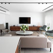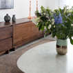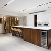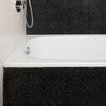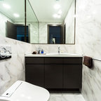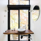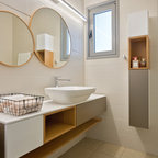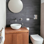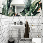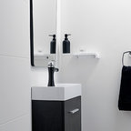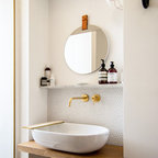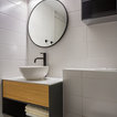 round mirror, simple cabinet and black tap...dont like the subway tiles