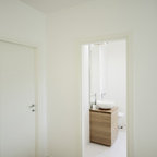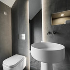 Idee per un piccolo bagno di servizio moderno con ante grigie, WC sospeso, piastrelle bianche, pareti bianche, pavimento grigio, top bianco, ante lisce e lavabo a bacinella — Houzz
