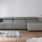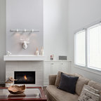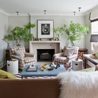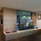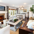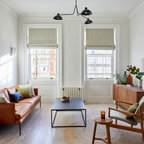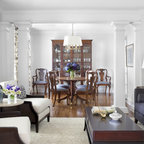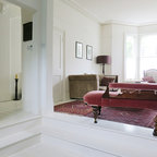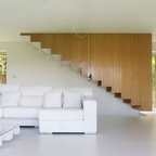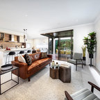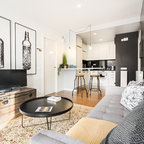 Foto di un soggiorno design di medie dimensioni e aperto con pareti bianche e parquet scuro — Houzz